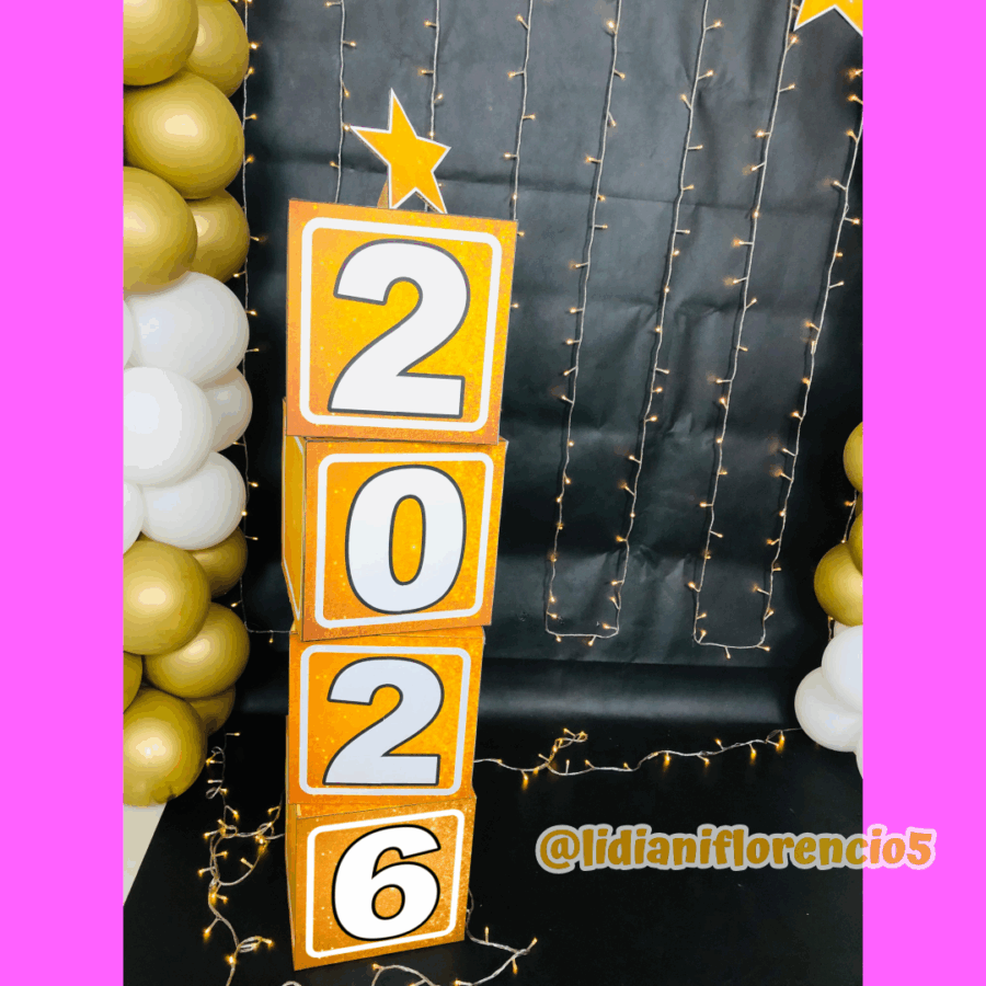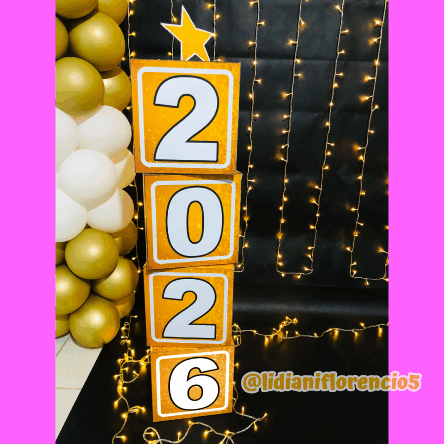 Receba as famílias com um cenário dourado e brilhante para fotos inesquecíveis! Arquivo digital com letras grandes, estrelas e números 2026 para montar.