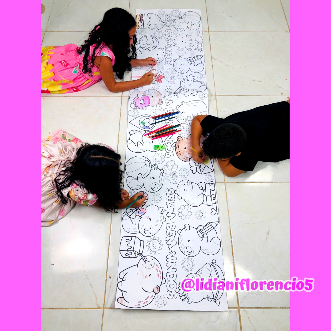 Como usar: fixe no chão/mesa, distribua lápis/giz/canetinha e deixe a criatividade brilhar. Depois, exponha com a frase “Sejam Bem-Vindos!” 🦫💛